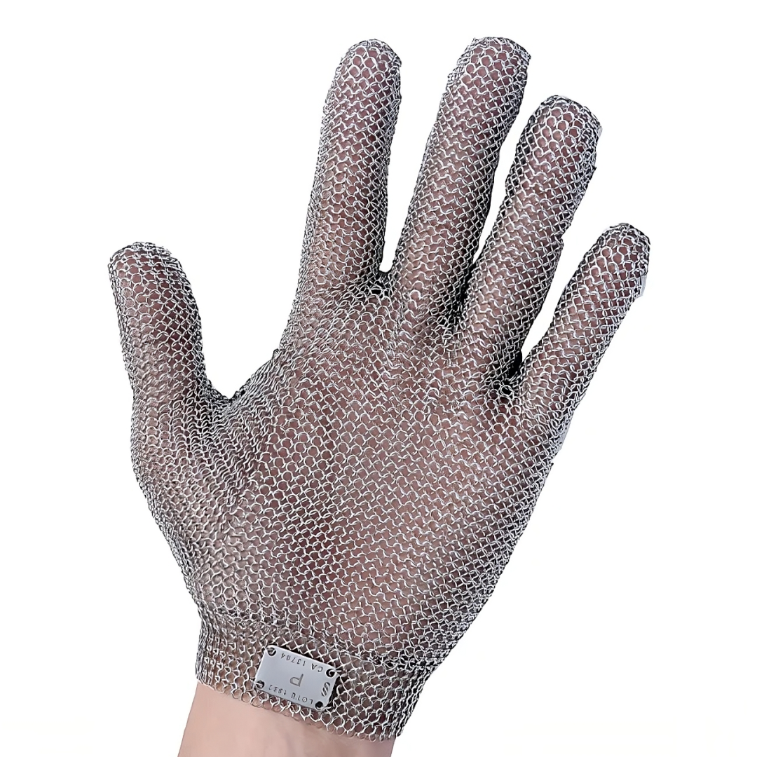 Fabricada com malha de aço inoxidável de alta resistência, garante segurança sem comprometer a mobilidade das mãos.