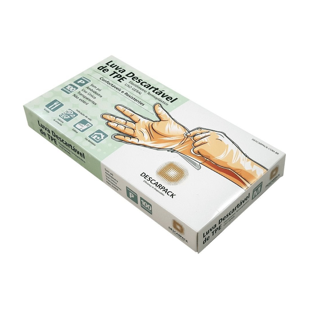 A Luva Descartável TPE sem Pó Descarpack é confeccionada em elastômero termoplástico, oferecendo uma barreira física eficiente para proteção das mãos e redução dos riscos de contaminação. Isenta de pó, é ambidestra, confortável, resistente e de uso único. Sua transparência permite visualização da pele, sendo ideal para procedimentos estéticos, manipulação de alimentos, nutrição, limpeza doméstica e outras atividades que exijam higiene e segurança. Por não ser considerada EPI, dispensa Certificado de Aprovação (CA). Produto não estéril, embalado em cartucho com 100 unidades.